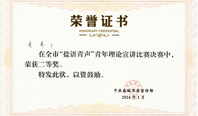 1月5日下午,全市“鹽語青聲”青年理論宣講比賽決賽在東臺黃海國家森林公園舉行。集團職工參賽作品《捐軀赴國難,視死忽如歸 ——永遠的英雄程步鳳》獲得二等獎。2024-01-10 -