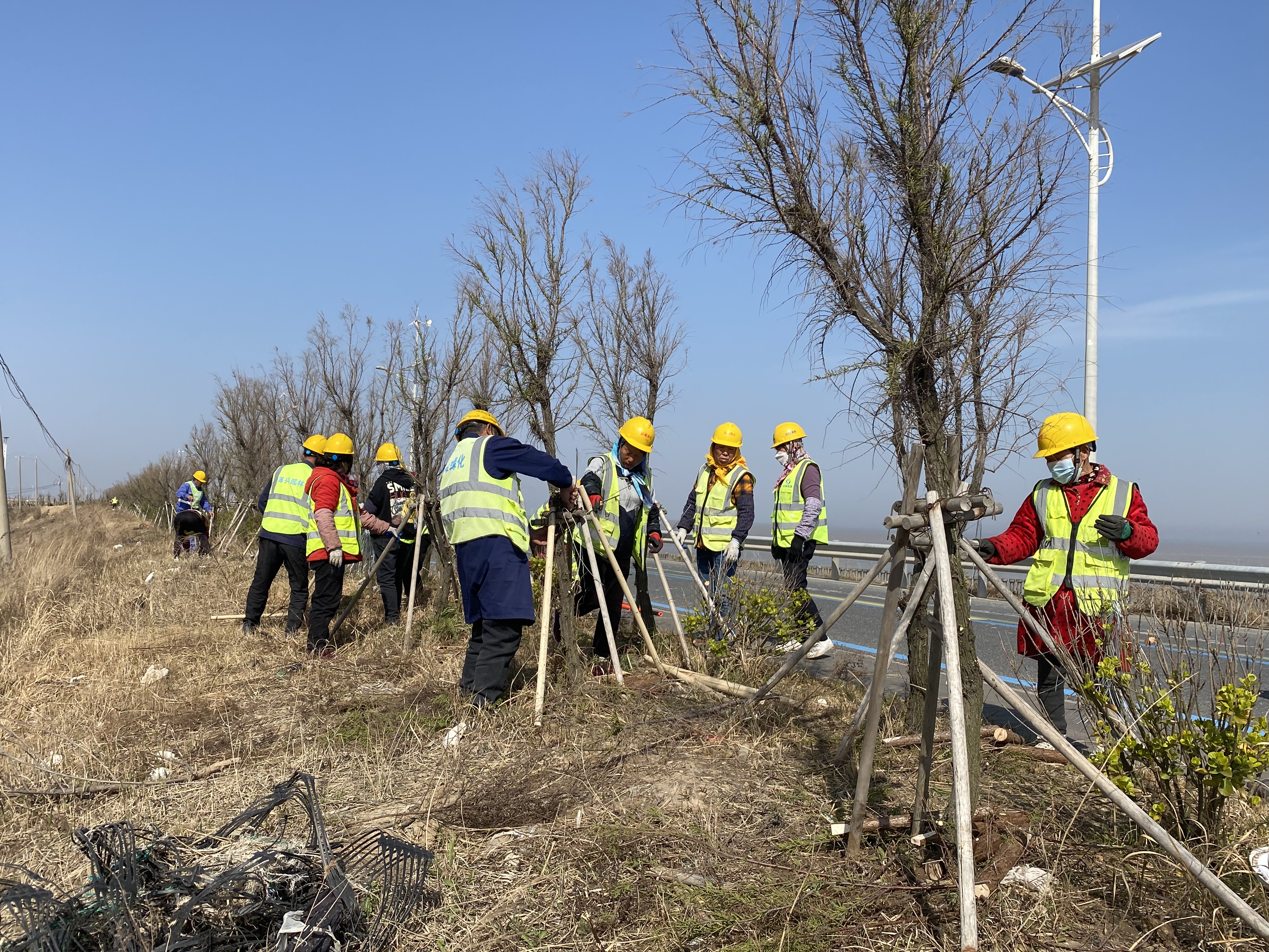 春回大地,萬物復蘇,隨著春季氣溫回暖,綠化樹木由休眠期轉入生長期,海堤路邊的鹽松經過潮汛強風的洗禮后,部分樹苗出現傾斜或倒伏情況。近日,黨員干部發揮帶頭作用,新灘鹽場共120余名干部職工開展苗木扶正專項行動。2023-04-06 -