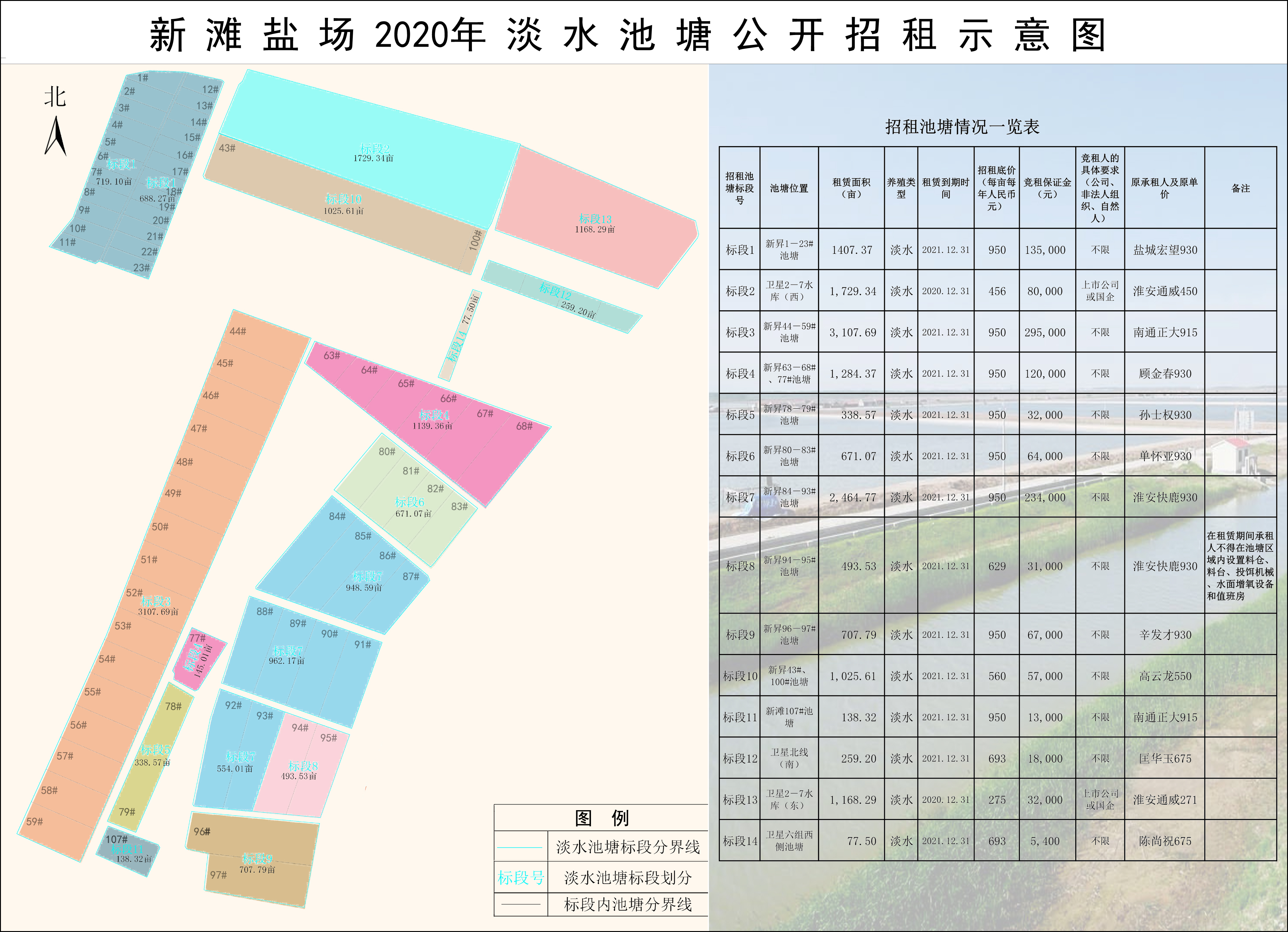 2.實行“一塘一價”,競租人按照《招租池塘情況一覽表》中各個標段號的招租池塘的招租底價、租賃期限、競租保證金數額和對競租人條件的具體要求等情況進行報名競租。